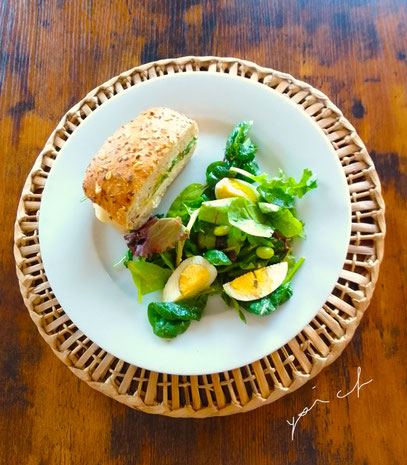 カリフォルニア州砂漠の町より リッチゆかりです。 最近の我が家の お楽しみ 買ってきたサンドウィッチと 手づくりサラダの ランチです。 🎵 雑穀いっぱいのパンに ターキー スモークチーズ リンゴ アルグラ入り リンゴの甘い シャキシャキ感 アルグラ葉の 少し苦みのある味わい と、歯ごたえ ミックスハーブサラダには 枝豆やゆで卵を添えて ハーブとハチミツ入り...